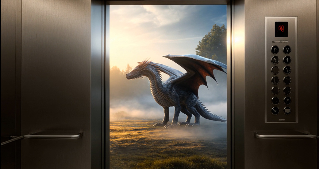 Floor One is Music: a vocalist in the pocket, HUD waveform pulsing, “Custom tracks. Tight mixes. TikTok-ready.” It’s a proof-in-one-shot moment—no lecture, just a vibe that reads instantly on mobile. Floor Two is Video: a dragon lands, wings folding as dust rolls across the lens; a rider dismounts; Grant deadpans, “You said cinematic.” The scale is aspirational, the tone stays brand-safe.